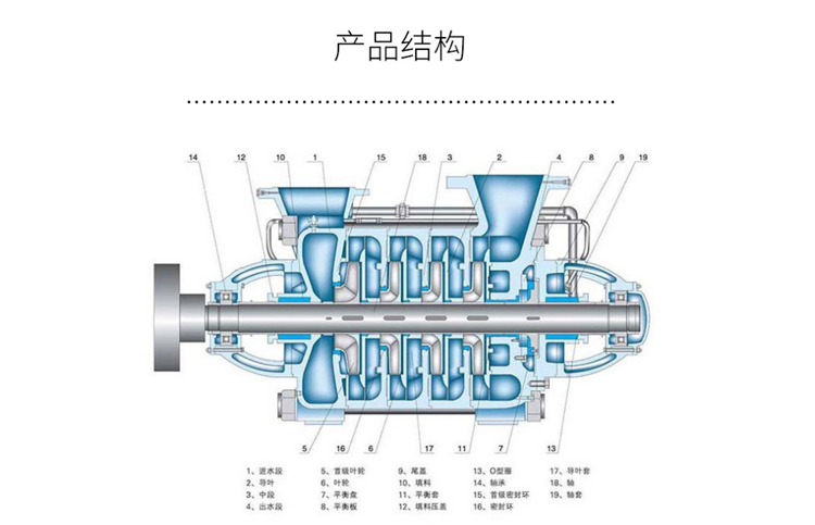 基本构造是由进水段、出水段、中段、尾盖、叶轮,泵体,泵轴,轴承,密封环,填料函等部件构成。
