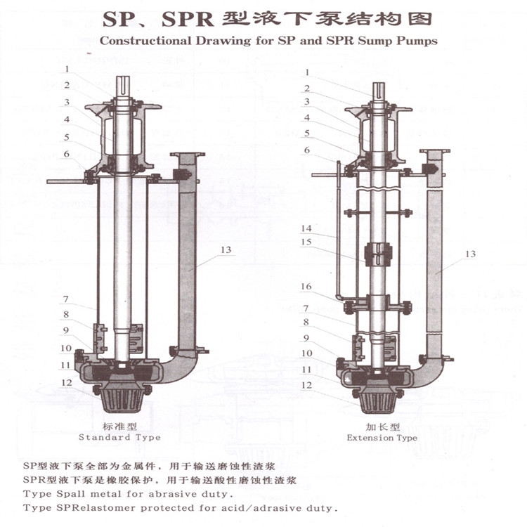 耐腐蚀液下渣浆泵为单级、单吸悬臂式结构,用轴承座,支承座,联接管连接泵的水力部件,液体由出液管部件排出,泵的叶轮为半开式叶轮,在叶轮叶片进口延伸处设有搅拌叶片,该泵主要特点是在液下部位的泵轴,有足够的刚度,叶轮,泵壳之间不设轴承,不采用轴封,可以输送含有较大浓度固定颗粒的介质。泵插入液下的长度在800-2000之间,如果需要可以配带吸入管。轴封采用较大泵插入液体中运行,不设轴封,传动由立式电动机安装在电机支承和支承座上,用联轴器与泵相连。 YZ型、sp型,ZJL型是立式单级单吸悬臂式离心泵结构,叶轮为半开式叶轮,在叶轮吸入边延伸处设有搅拌叶片。
