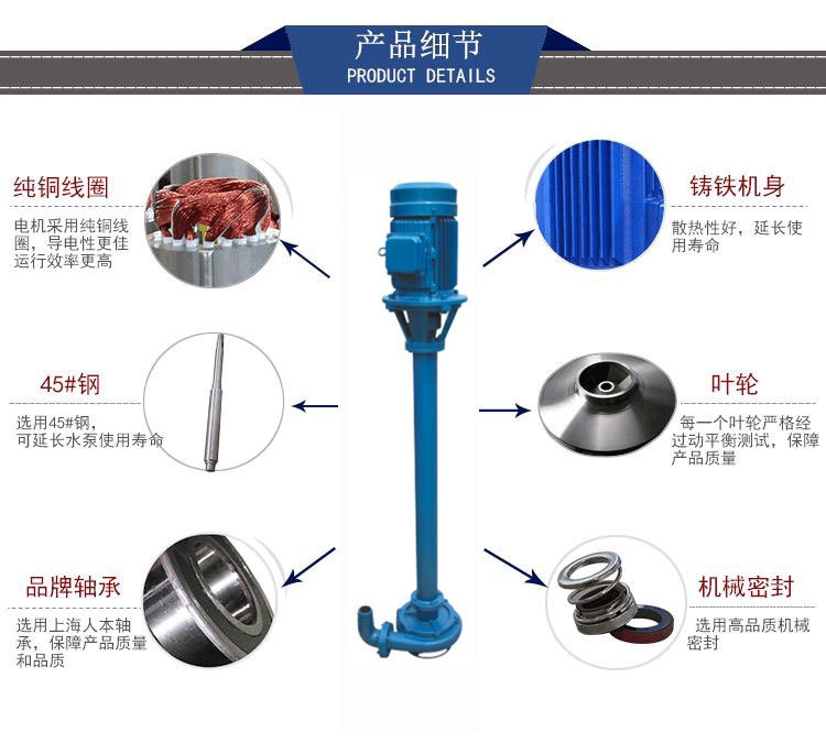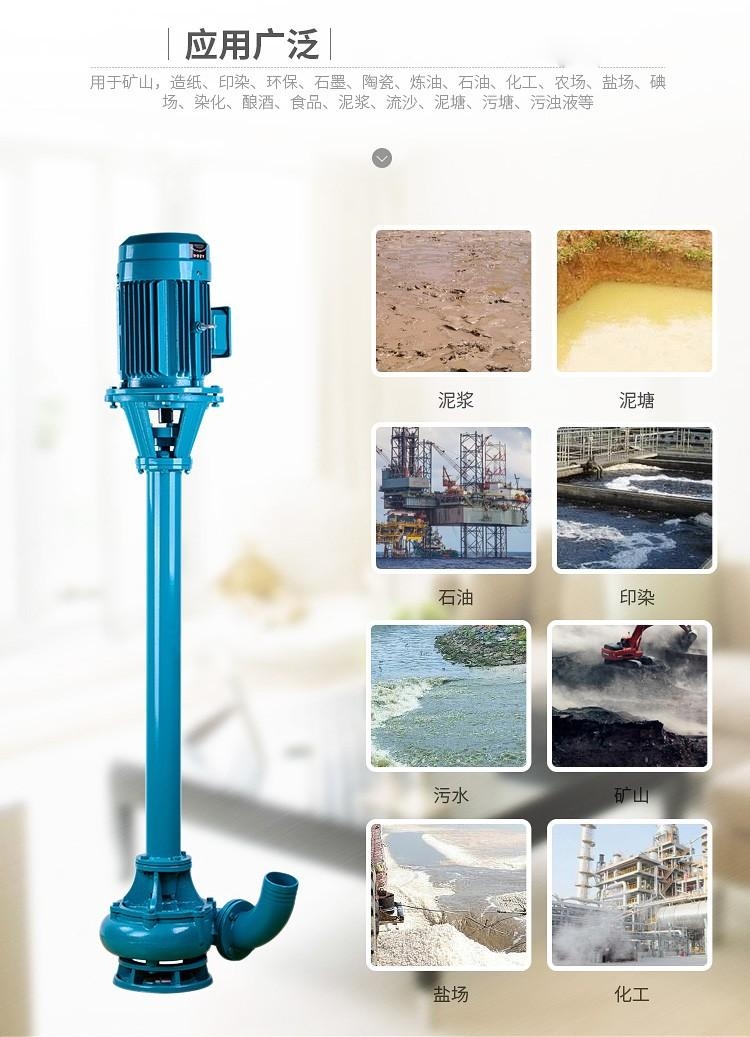 立式泥浆泵叶轮为三片单园弦弯叶,选用半封闭叶轮,并采用可锻铸铁、所以强度高,耐腐蚀;加工方便,通过性好,效率高。为了减轻重量和减少车削量、泵轴是优质碳素钢冷拉园钢制造。泵座中装有四只骨架油封和轴套,防止轴磨损,延长轴的使用寿命。泵可垂直或倾斜使用,占地面积小,蜗壳需埋在工作介质中工作,容易启动,不需弓I水,旋转方向应从电机尾部看是顺时针方向工作。总机长度备有各种规格,以便使用单位根据用途因地制宜地选用。
