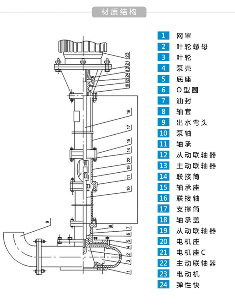 立式泥浆泵系单级单吸立式离心泵,配件主要部件有蜗壳、叶轮、泵座、泵壳、支撑筒、电机座、电动机等组成。蜗壳、泵座、电机座、叶轮螺母是生铁铸造、耐腐性、耐腐蚀性较好,加工工艺方便。