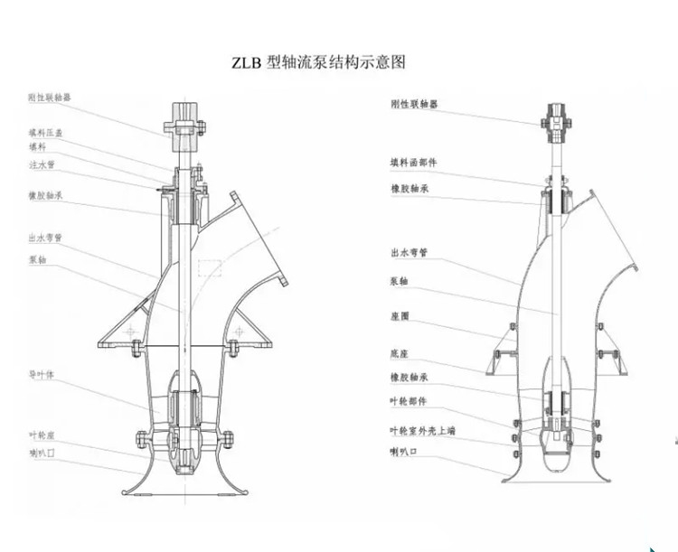 结构:对于立式轴流泵,泵和电机分别安装在两个基础层,泵的轴向推力由电机承受,泵的轴承为橡胶导轴承,密封为填料密封。对于卧式(斜式)轴.流泵,整个泵系统由水力流道、泵本体、传动、电机和辅助设备等几部分组成。传动部分为齿轮减速箱。