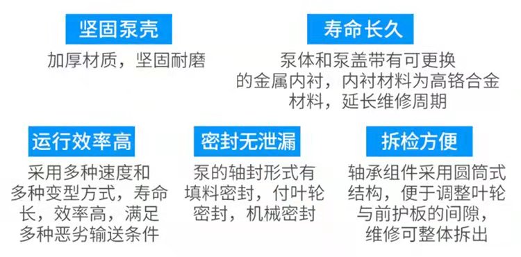 压滤机入料泵 双叶轮给料专用泵的实际工作点由泵的曲线与泵的装置特性曲线的交点来确定。选择和使用泵,应使泵的工作点落在工作范围内,以保证运转经济性和安全。此外,同一台泵输送粘度不同的液体时,其特性曲线也会改变。通常,泵制造厂所给的特性曲线大多是指输送清洁冷水时的特性曲线。对于动力式泵,随着液体粘度增大,扬程和效率降低,轴功率增大,所以工业上有时将粘度大的液体加热使粘性变小,以提高输送效率。