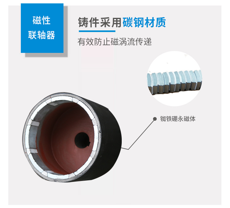 磁力驱动泵由泵、磁力传动器、电动机三部分组成。关键部件磁力传动器由外磁转子 、内磁转子及不导磁的隔离套组成。当电动机带动外磁转子旋转时,磁场能穿透空气隙和非磁性物质,带动与叶轮相连的内磁转子作同步旋转,实现动力的无接触传递,将动密封转化为静密封。由于泵轴 、内磁转子被泵体、隔离套封闭,从而解决了"跑、冒、滴、漏"问题,消除了炼油化工行业易燃 、易爆、有毒、有害介质通过泵密封泄漏的安全隐患。